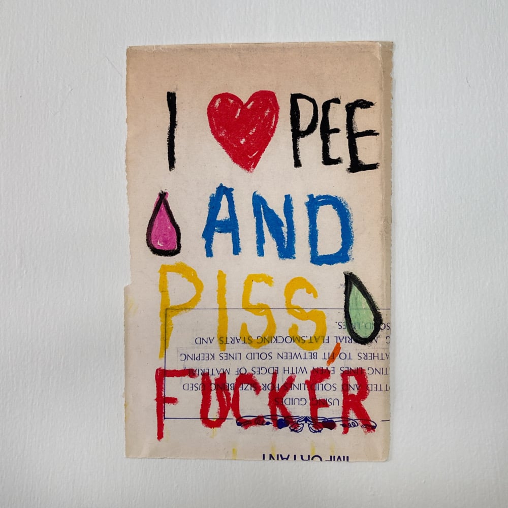 I ❤️ Pee And Piss, Fucker. Oil Pastels on Antique Paper. Roughly 5.5x9”. Perfect stocking stuffer.
