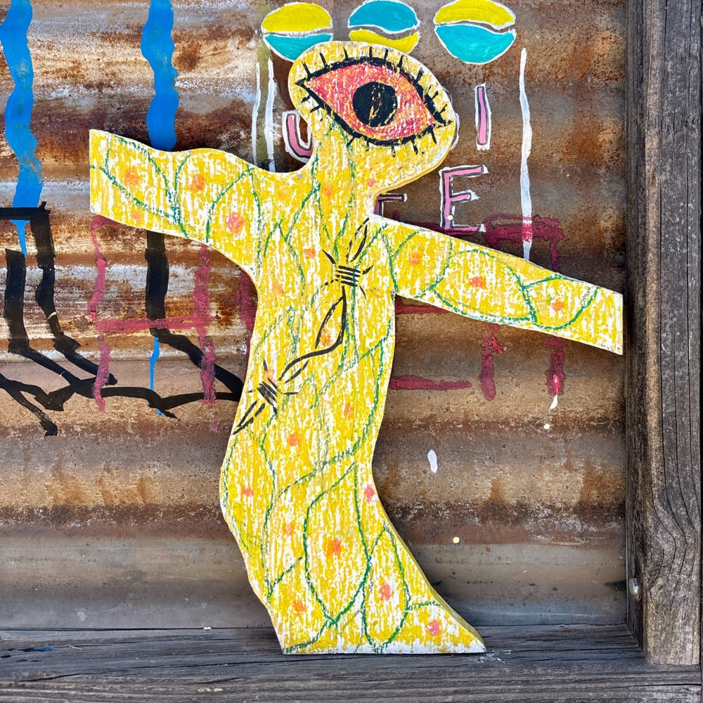 Acrylic and oil pastels on wooden panel. Roughly 18” tall by 16" wide. Perfect gift for the weirdo in your crew.